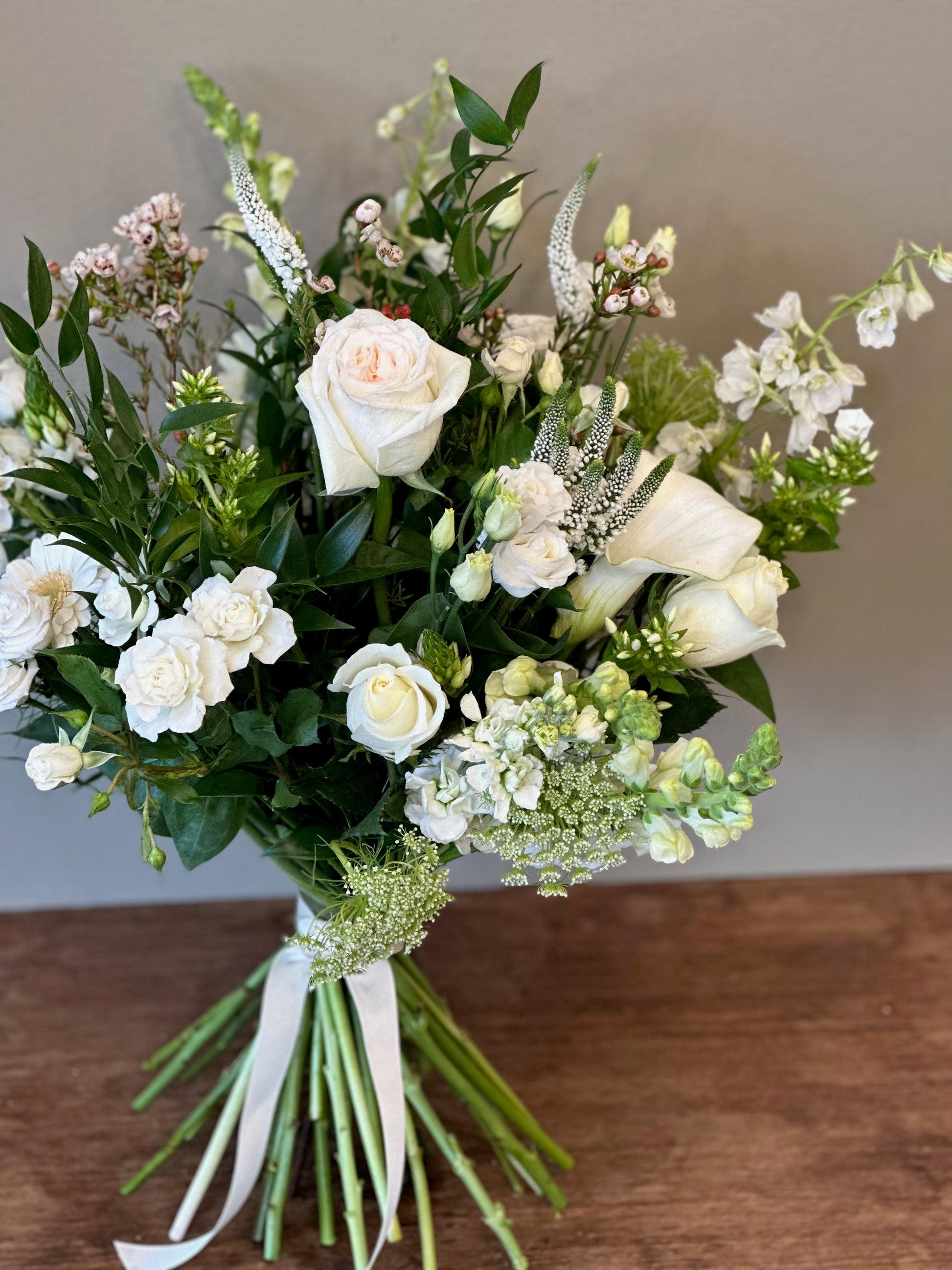 our classic white bouquets are bespoke and created by our experienced florists using the freshest flowers available on the day. Please remember whilst your gift will look different to the one pictured we will make sure we follow your instructions and requests to make it extra special.